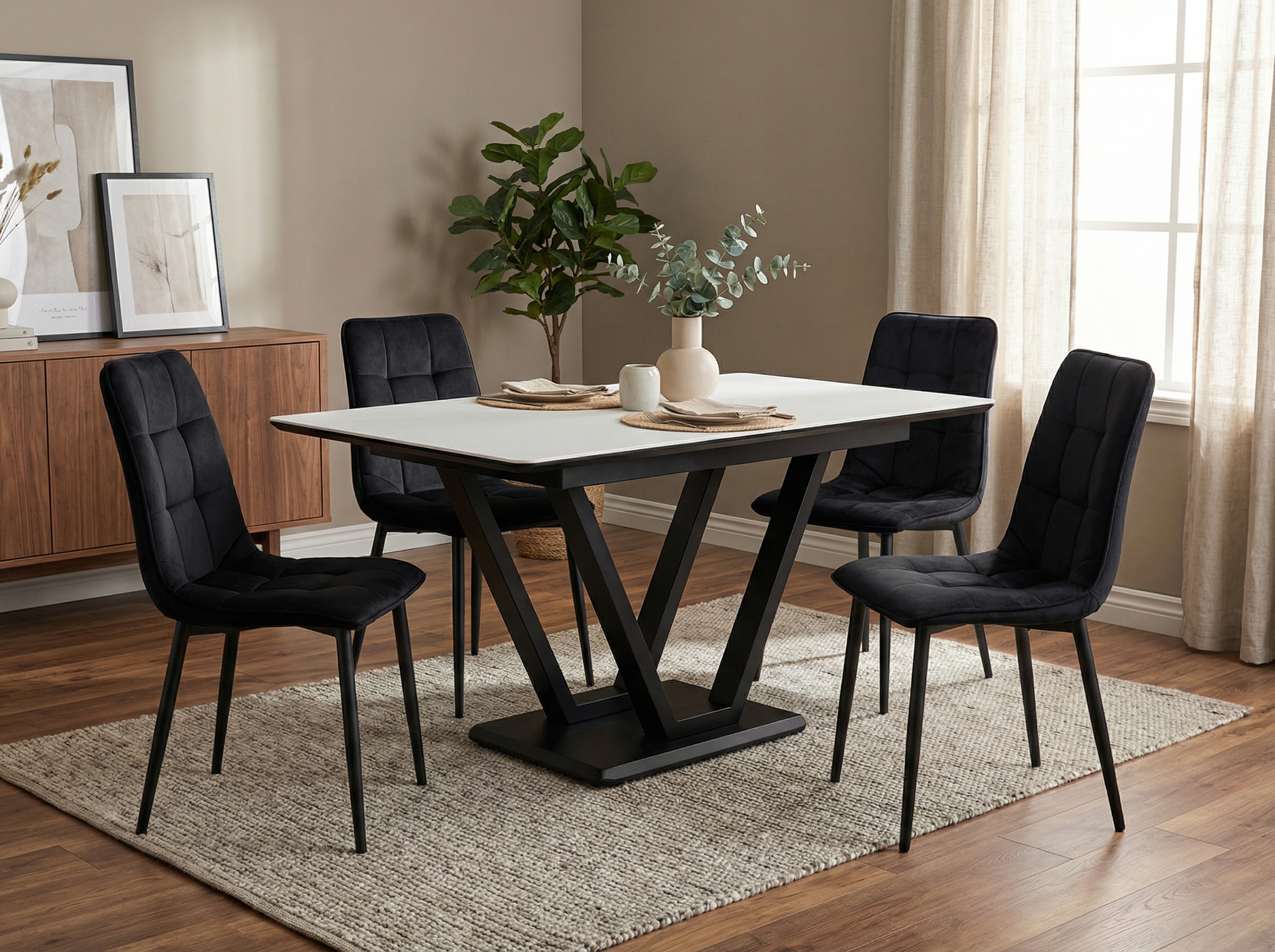 Эта обеденная зона идеально подходит для тех, кто ценит философию хюгге — сочетание красоты и удобства. Светлая столешница в паре с контрастными черными опорами создает стильный визуальный баланс, который легко впишется в любой современный интерьер, от лофта до неоклассики.