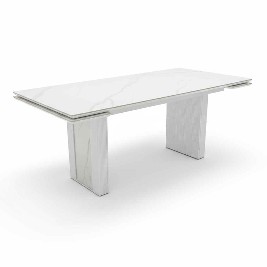 Стол «Джорджио» — это воплощение современного стиля и практичности. Прямоугольная столешница из высококачественной керамики с текстурой белого мрамора не только выглядит роскошно, но и обладает исключительной износостойкостью: она не боится царапин, влаги и высоких температур. Это идеальный выбор для тех, кто ценит долговечную эстетику в интерьере.