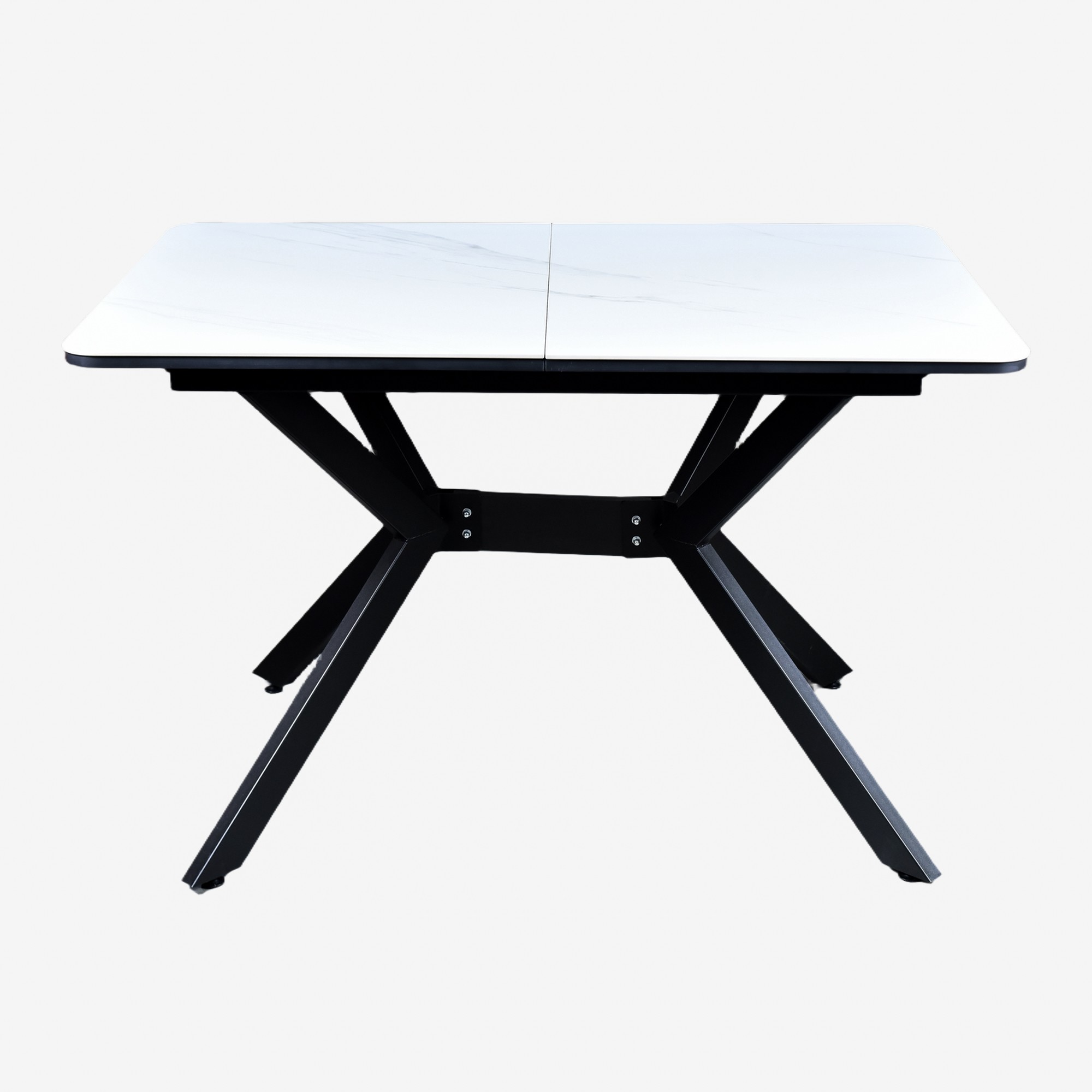 Комбинация керамики и металла делает этот стол практически неуязвимым к повседневному износу. Столешница устойчива к царапинам, воздействию влаги и перепадам температур, что особенно важно для обеденной зоны. Геометричное подстолье из металла обеспечивает максимальную устойчивость конструкции даже в полностью разложенном состоянии.